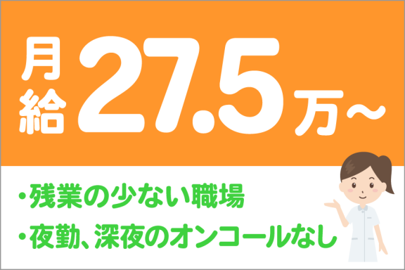 | 給与内訳 | 基本給:204,000円~ その他手当:20,000円 資格手当:30,000円 オンコール手当:18,000円 処遇手当:3,000円 |
