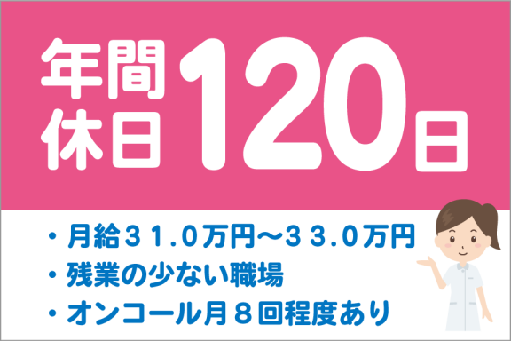 | 給与内訳 | 月給:310,000円〜330,000円 オンコール手当(月に8回程度) ・平日は500円/回 ・土・日は2,000円/回 |